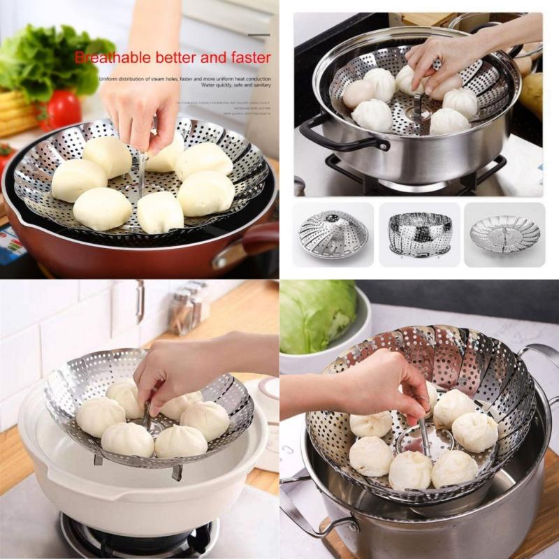 the vegetable steamer can be multi used as a stainer, fruit basket, serving bowl. the foldable steamer also used to steam veggies, seafood, eggs meats, baby food and much more. it comes with three stand and one handle easy to clean and use.